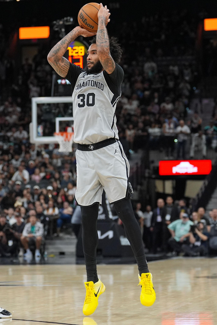 谢泼德不仅防守端被针对,进攻端的持球自主进攻戏份也被马刺强壮的摇摆锋卫群压到了最低,上半场非常依赖无球走位接球投射。